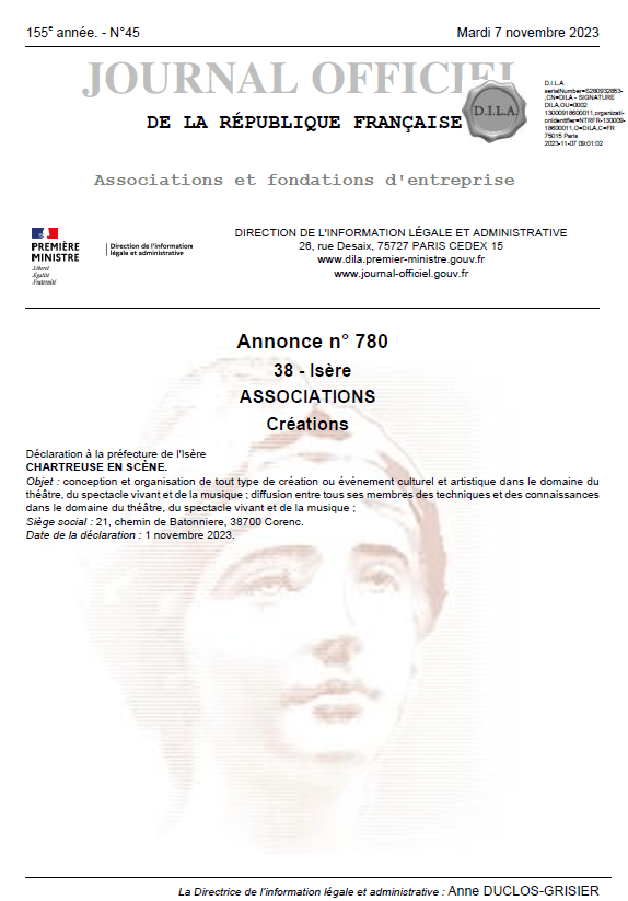 Chartreuse en Scène est une association, reconnue d’intérêt général, créée le 7 novembre 2023 et régie par la loi du 1er juillet 1901 et le décret du 16 août 1901.